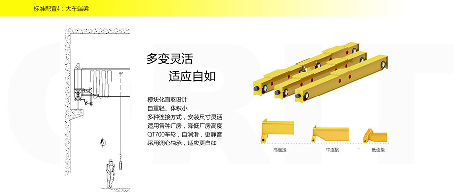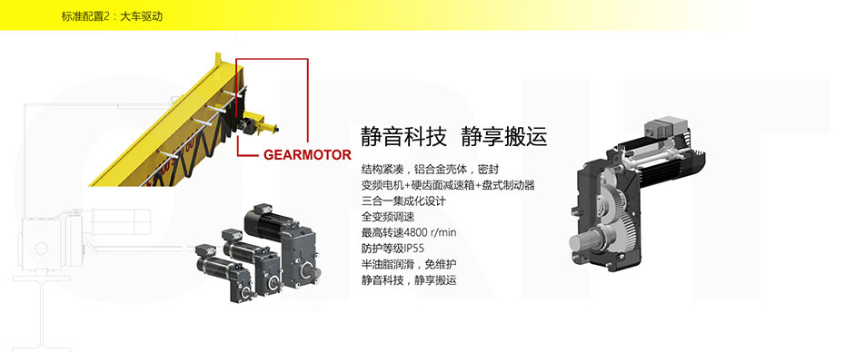 小身材,大能力,高智慧。優(yōu)化設(shè)計(jì),自重輕,輪壓小,高度矮。硬齒面柔性驅(qū)動(dòng),緊湊型結(jié)構(gòu)。變頻控制,運(yùn)行平穩(wěn)。實(shí)時(shí)安全監(jiān)控,確保吊運(yùn)安全。標(biāo)準(zhǔn)化統(tǒng)一配置,讓整機(jī)性能更加穩(wěn)定。適用于32t以下額定載荷。